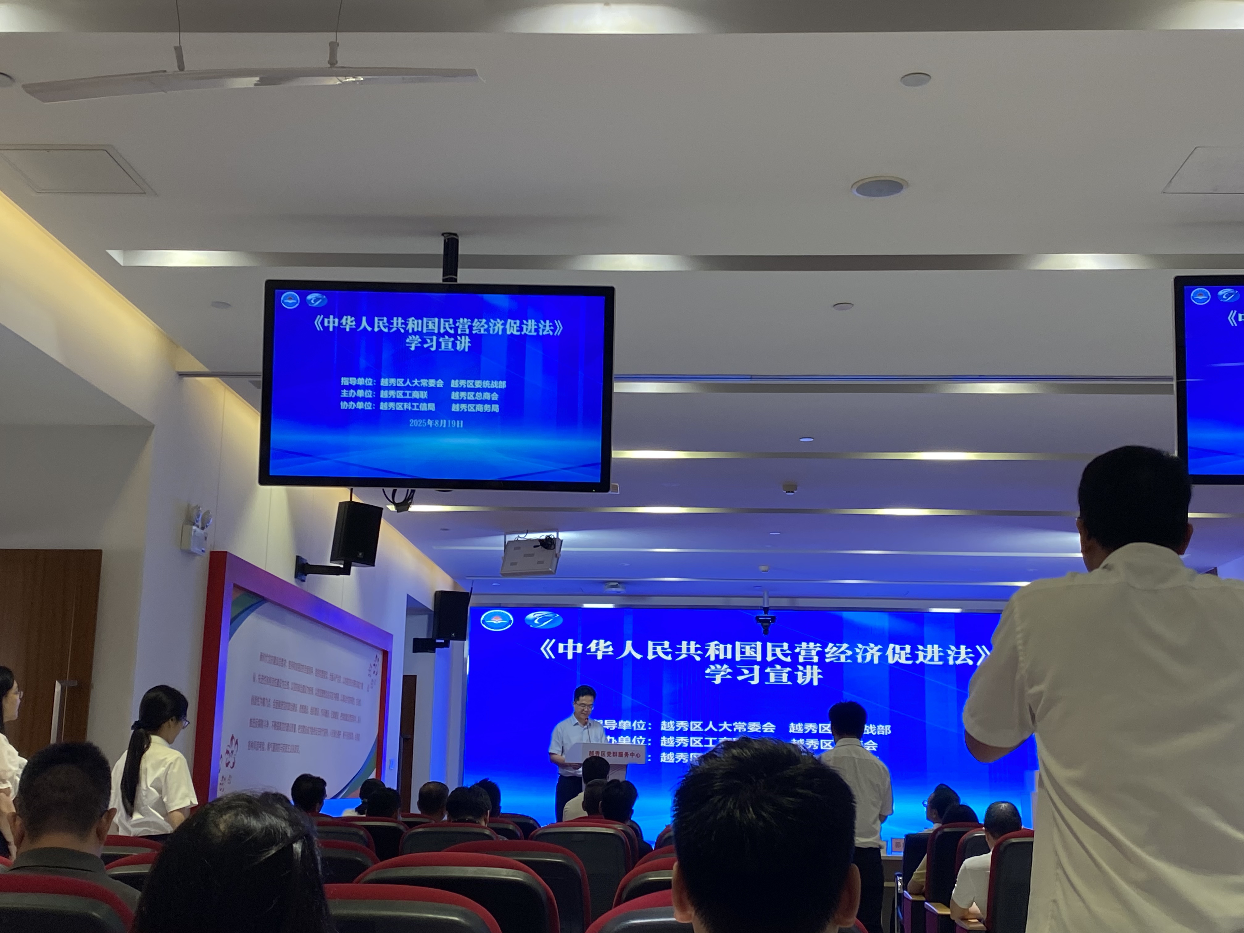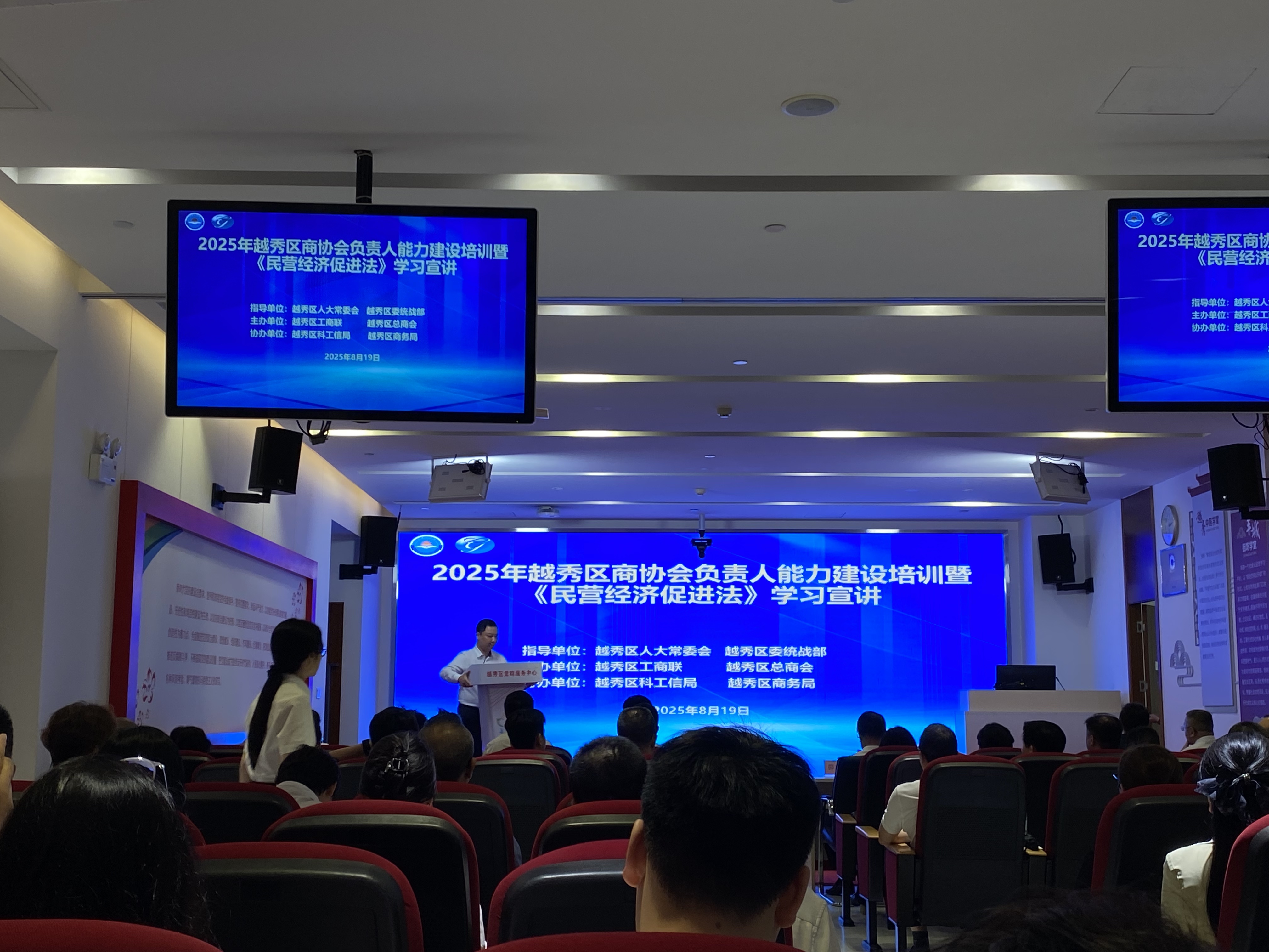 为深入贯彻落实《民营经济促进法》,进一步加强越秀区内商协会建设,推动《民营经济促进法》的学习宣传和贯彻实施,8月19日,在越秀区人大常委会、区委统战部的指导下,越秀区工商联(总商会)在越秀区党群服务中心成功举办了2025年越秀区商协会负责人能力建设培训暨《民营经济促进法》学习宣讲。越秀区人大常委会副主任罗学文,越秀区政协副主席、区工商联主席、广东海印集团股份有限公司董事长邵建明,以及来自区人大办公室、预算工委、区工商联、区科工信局、区商务局、区公安分局等部门、各商协会会长、秘书长、民营企业代表等约100人参加本次学习。我会常务副会长张卓宇、常务副秘书长何瑞瑛代表参加。